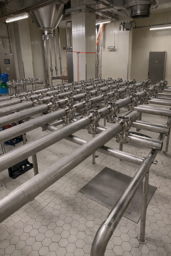 Stainless steel utility piping installation in industrial facility.