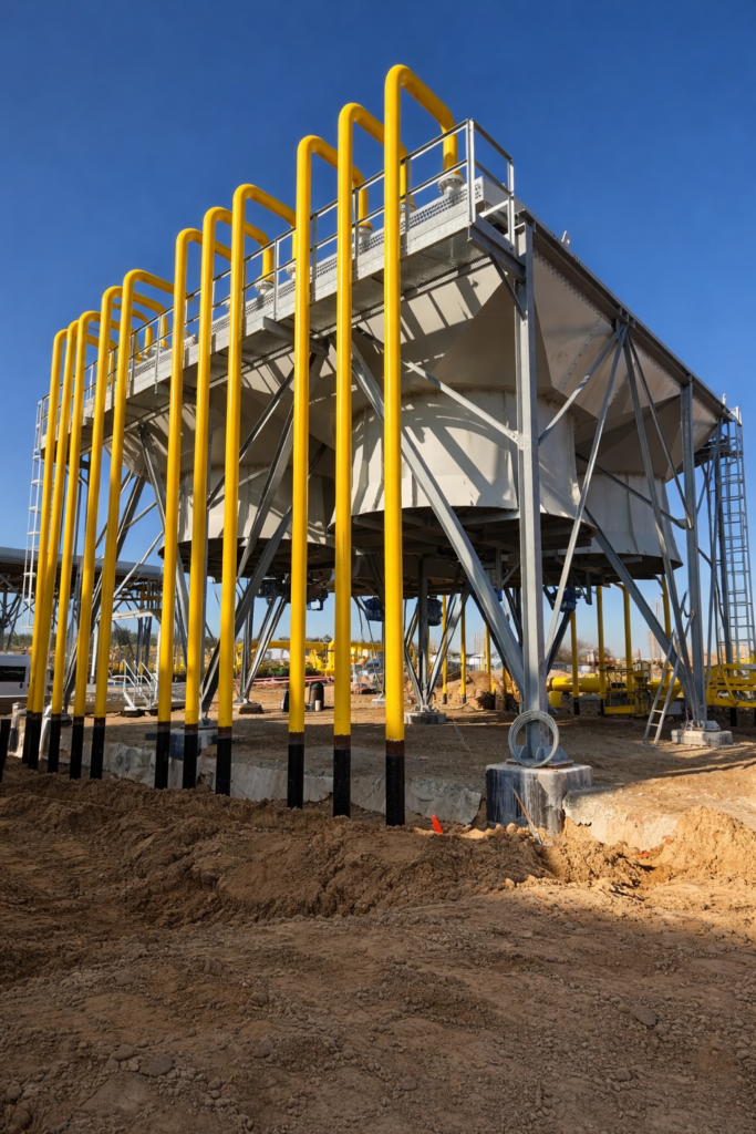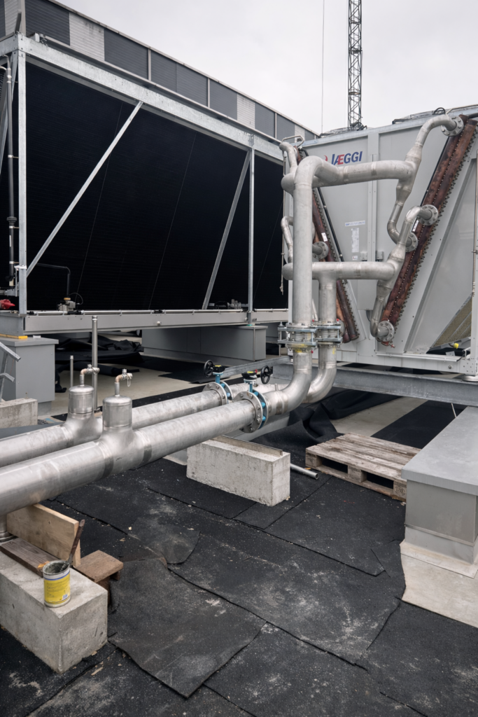 Installation of carbon steel piping for cooling unit systems. Structural support, precise fit-up and on-site assembly. Designed for heavy-duty industrial infrastructure.