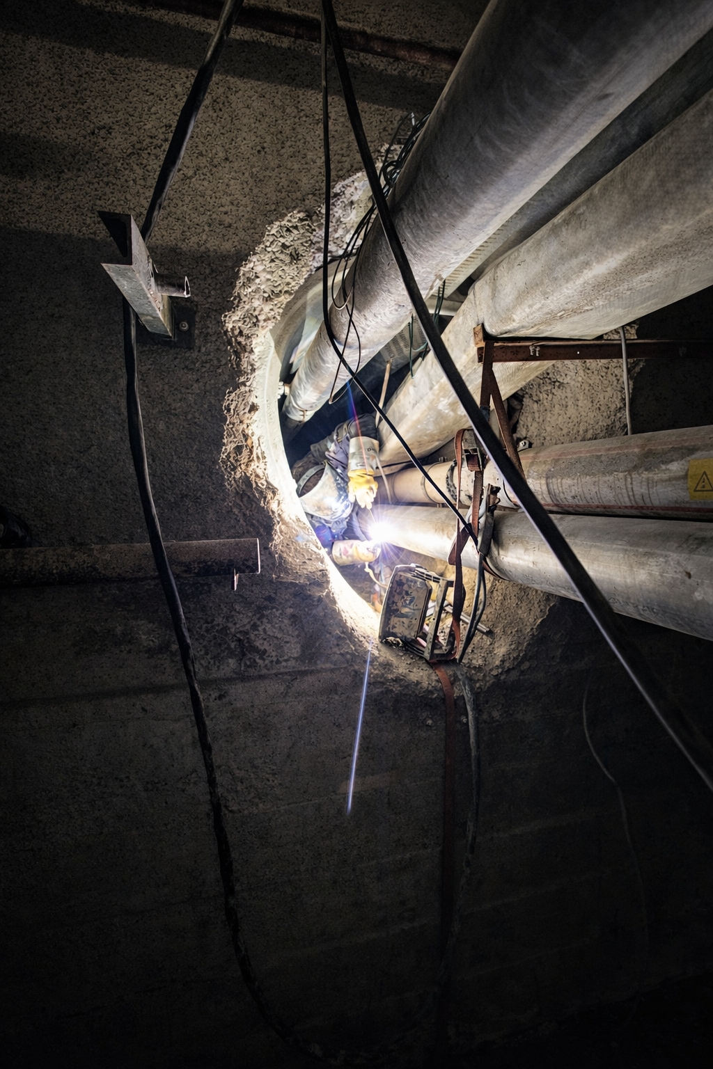 Welding works on industrial piping inside an underground tunnel at a cement factory. Operations carried out in confined space conditions, ensuring durability and compliance with industrial safety standards.