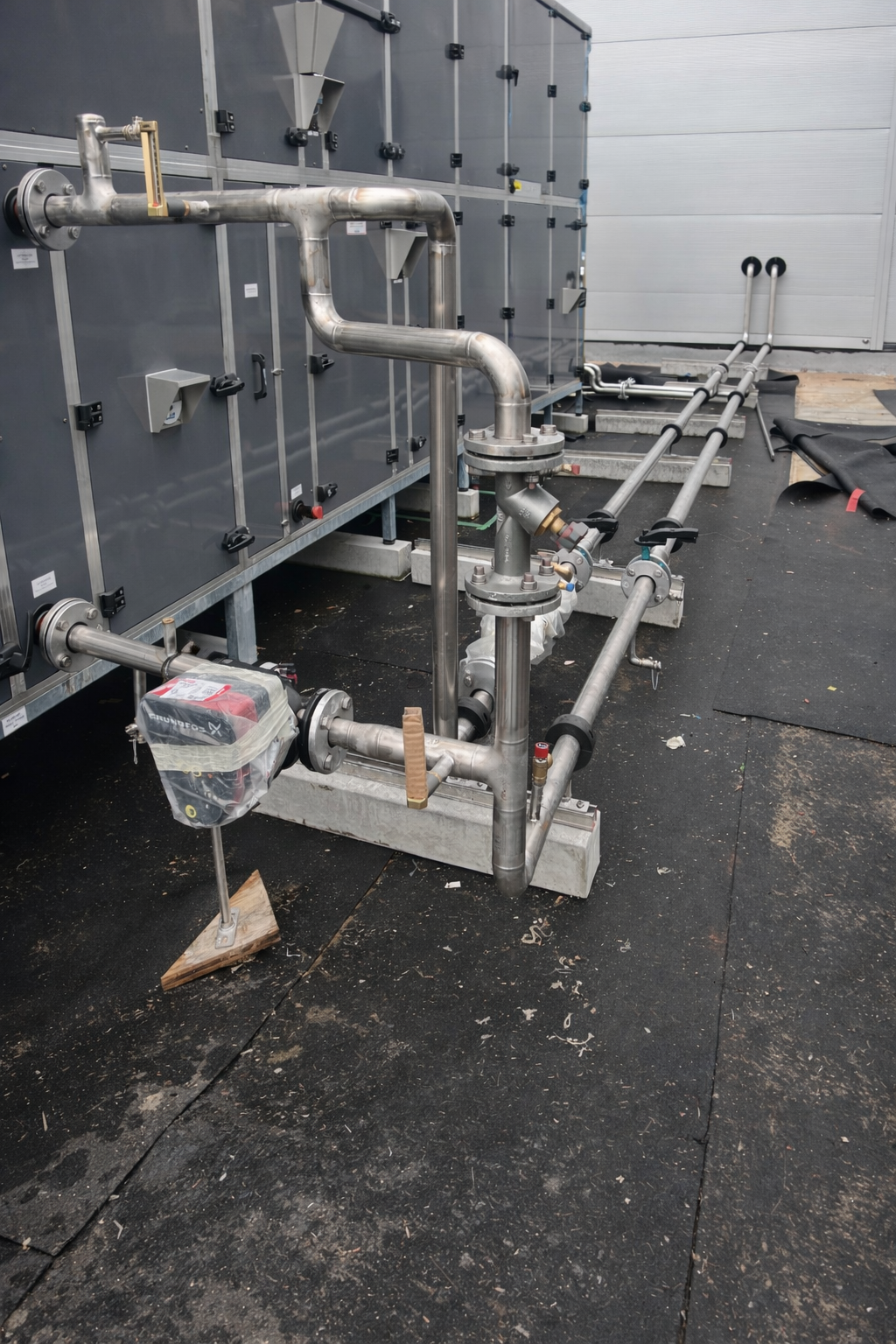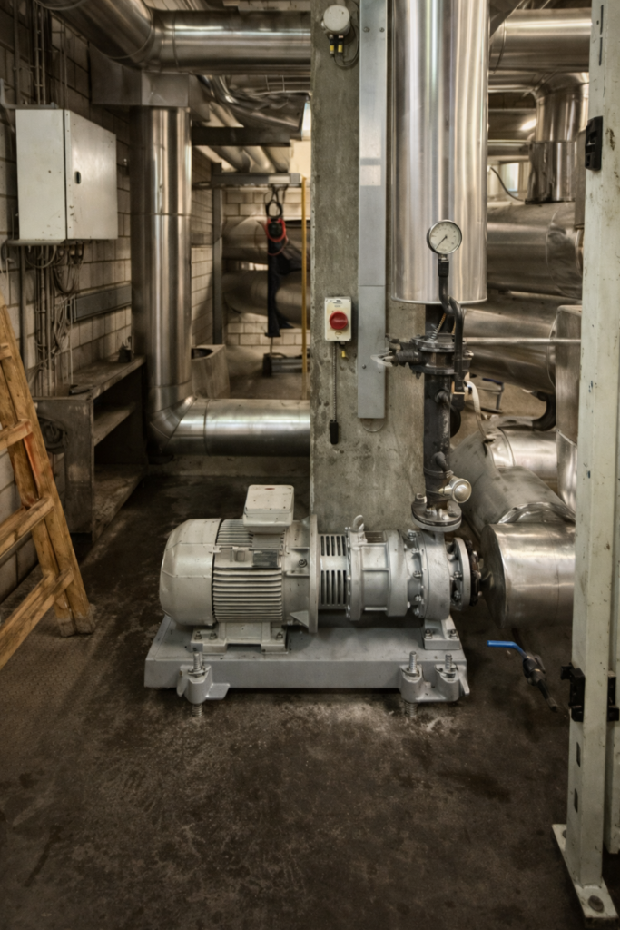 Installation of new industrial pump unit including pipe connection, alignment and flange assembly. System integration with existing stainless steel piping network. Commission-ready delivery according to industrial standards.