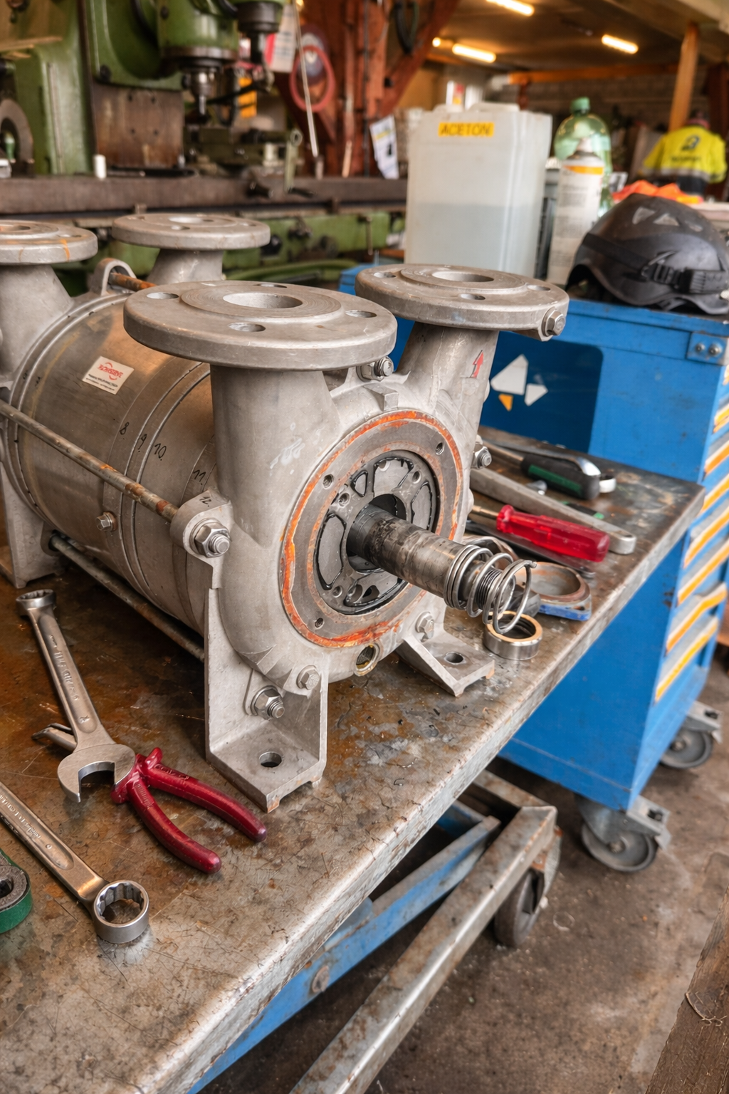Disassembly and inspection of industrial pump unit. Replacement of worn impeller components and sealing elements. Precision reassembly and alignment to restore full operational efficiency during scheduled shutdown.